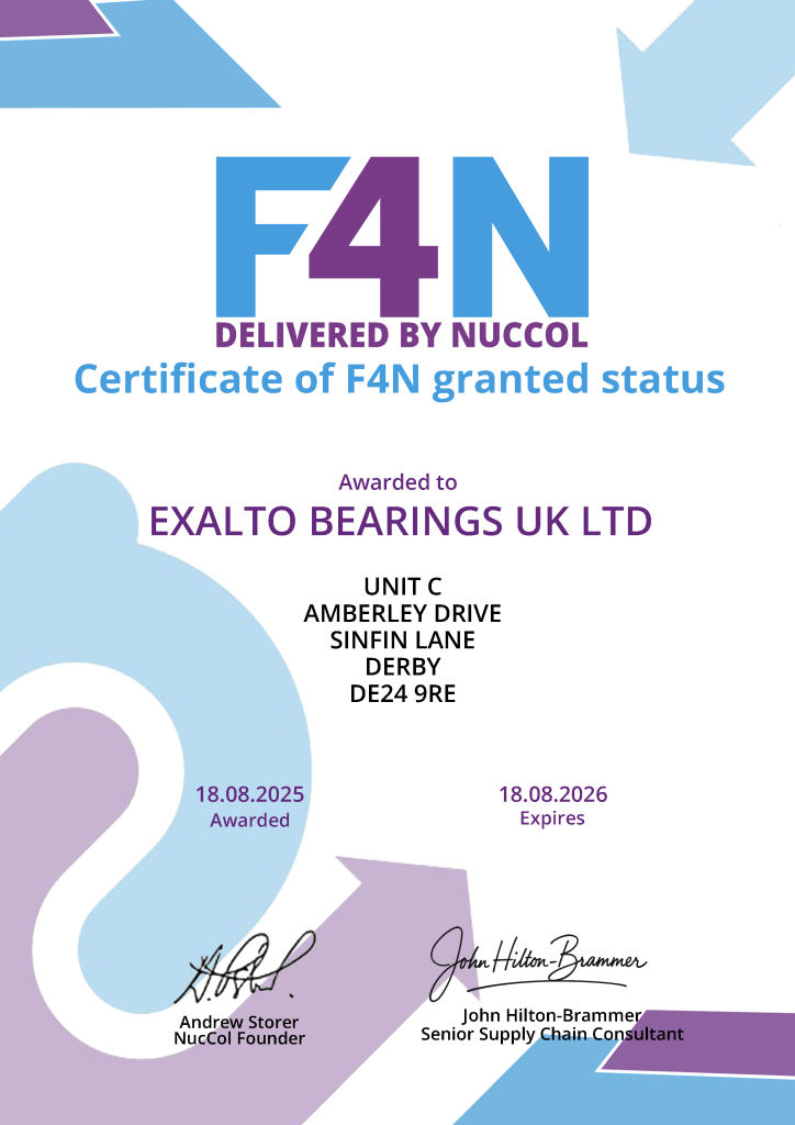 We’re proud to announce that Exalto Bearings has been granted Fit for Nuclear (F4N) status — a formal recognition that we meet the high standards expected of the UK civil nuclear supply chain.